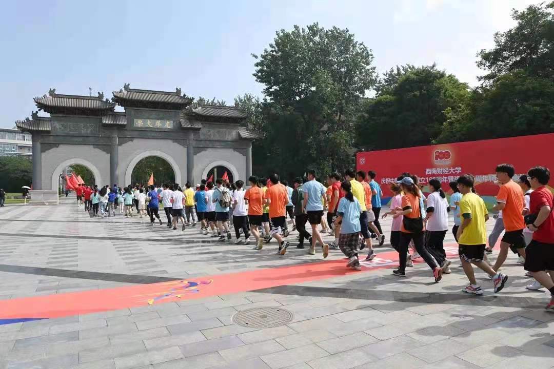 上午9:30,随着党委书记赵德武发令枪声响起,校庆健康跑正式开始!从光华大学门到北大门的跑步路线,宛如一道从黄浦江畔飞跃浣花溪旁点亮柳林华章的历史之光,照耀着西南财大96载弦歌不辍、兴学报国的光辉奋斗历程。健康跑队伍从光华大学门出发,追寻着光华路上的西财历史文脉,来到济民广场。“经世济民、孜孜以求”的口号响彻济民广场上空,每一声都包含着西财人始终与国家民族共命运,始终与时代发展同进步的家国深情。队伍在济民广场遥望钟楼,再次体悟学校历经三次创业始终如一的拳拳初心,一声声“听党话、感党恩、跟党走,铭初心、担使命”的铿锵呼号表达着西财人始终不渝的坚定信仰。道路两旁鲜艳的彩旗猎猎,终点之门在不远处巍然矗立,师生们步履矫健,怀揣建设财经特色鲜明的世界一流大学、建设社会主义现代化教育强国的满腔赤诚壮志迎向胜利的终点。