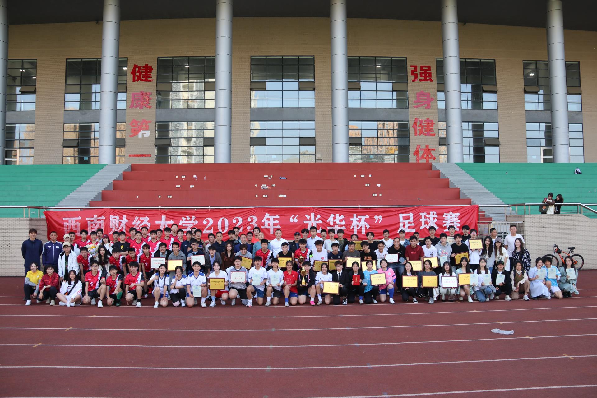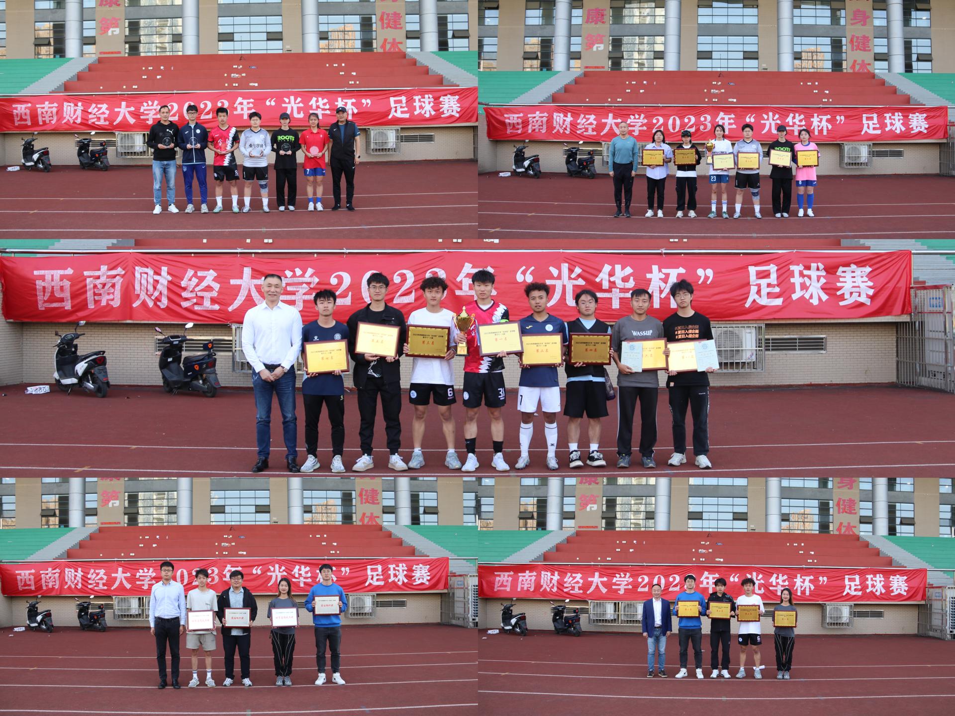 4月25日下午“礼赞新时代·奋进新征程,迎大运·迎百年校庆”2023年西南财经大学“光华杯”足球比赛颁奖仪式在晨曦足球场举行。乐投网站院长杨远波,学院党委书记周正宏,副院长阴涛、陈丛刊,副书记李治为获奖学院以及个人颁发了荣誉证书及奖牌。