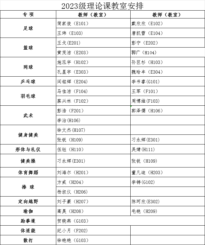 经教务处同意,本学期2023级本科生第1周体育课为乐动(中国)理论课,9月14日起恢复户外教学。根据教室资源状况,现将理论课具体安排通知如下: