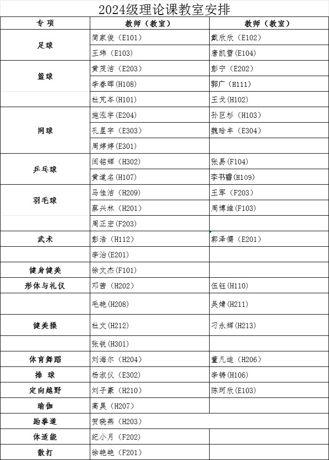 经教务处同意,本学期2024级本科生第1周体育课为乐动(中国)理论课,9月15日起恢复户外教学。根据教室资源状况,现将理论课具体安排通知如下: