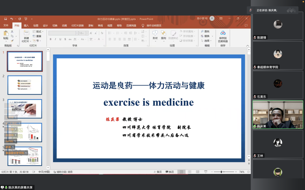 2022年11月10日,四川师范大学乐投网站副院长陈庆果教授在线上举办了题为《再谈运动与健康:运动是良医》的光华讲坛,乐投网站副院长陈丛刊主持本次讲座,乐投网站研究生、部分教师以及校内外师生等共计60余人参加了此次讲座。